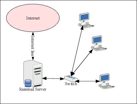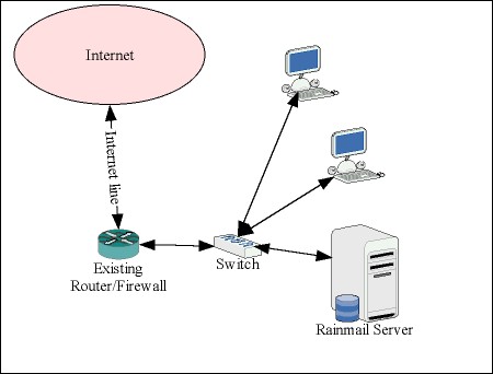 - Internet Gateway In this scenario, Rainmail Server sits on the perimeter between Internet and Local network. In this mode, Rainmail Firewall needs to be purchased/activated for security. Rainmail Firewall protects the local Network from attacks originating in the Internet. In this scenario, Rainmail Server should have two Network cards. One card will be connected to the Internet line and another to the local LAN switch. This architecture is diagrammatically represented as follows: