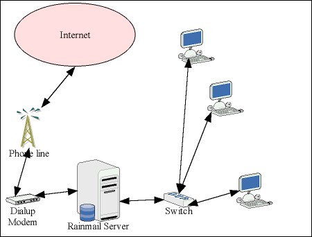 - Rainmail Server is connected to a Modem (using USB or Serial port). The modem, in turn is connected to a telephone line