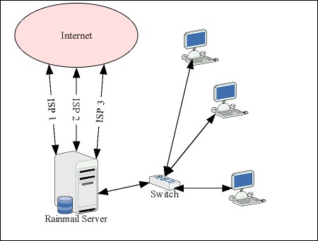 - Internet Gateway with multiple ISP lines This scenarios is similar to the above architecture. However, in this case, client has multiple ISP lines. Rainmail Server sits in the perimeter between the Internet lines and local network. In this case, Rainmail Firewall as well as Rainmail Bandwidth Aggregator should be activated. Rainmail Firewall will protect the local Network from any external attacks. Rainmail Bandwidth Aggregator will load balance multiple Internet links. In this case, if the number of Internet lines is N, Rainmail Server will need to have N+1 Network cards. This architecture is diagrammatically represented as follows: